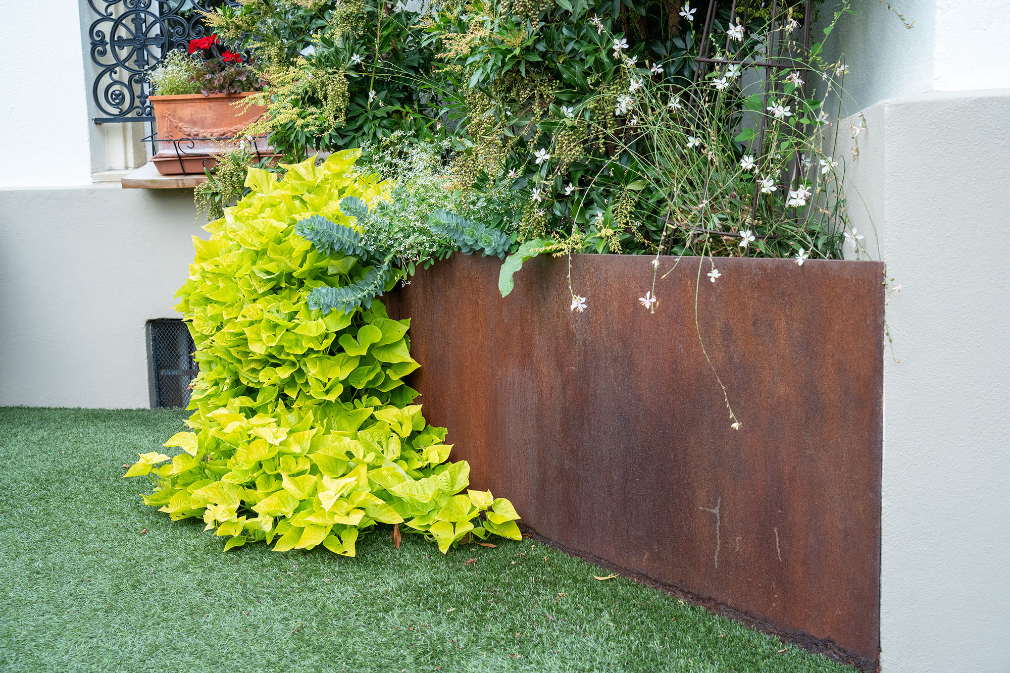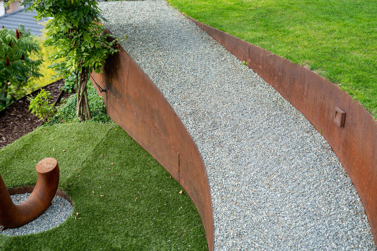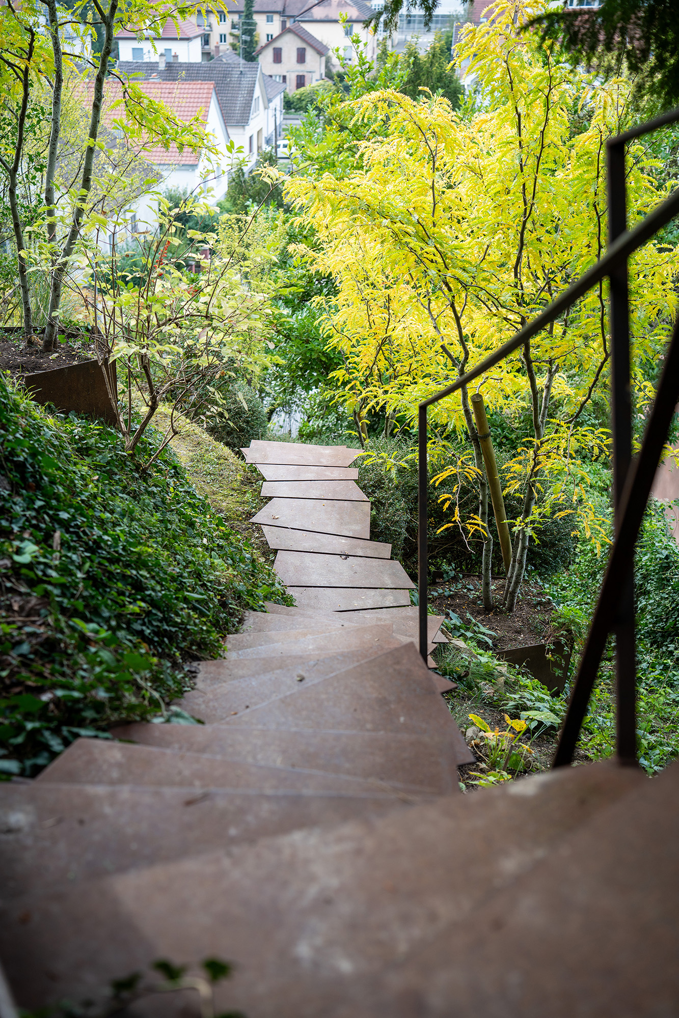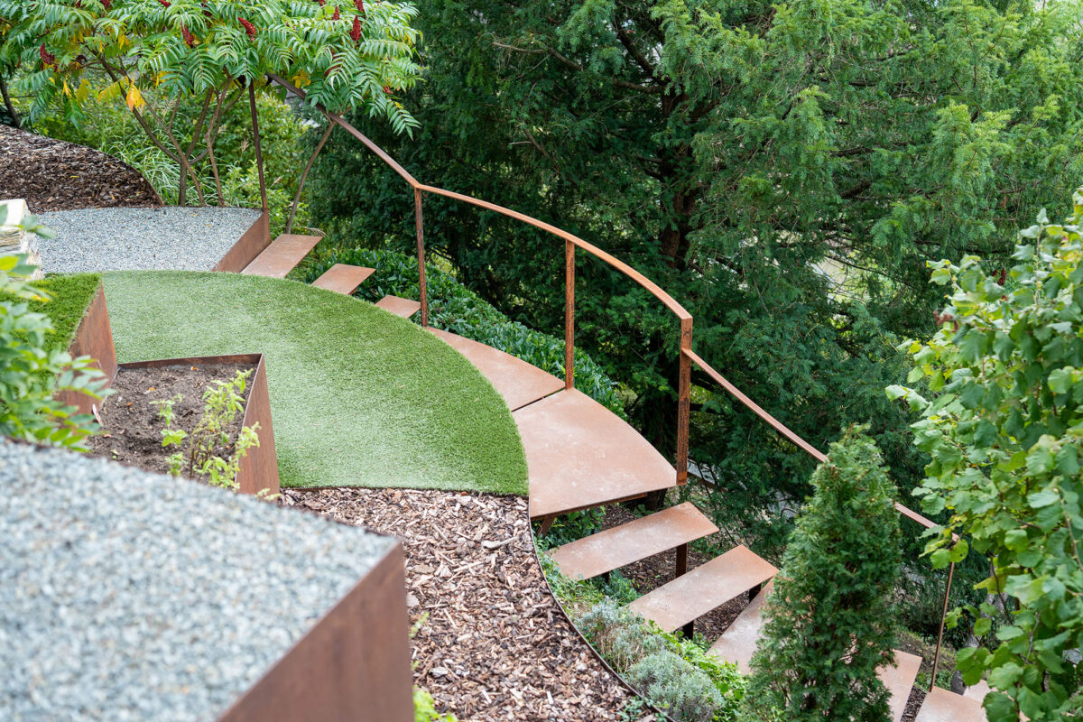 La réflexion a porté sur la manière de créer des « mondes » différents à chaque niveau, tout en facilitant l’accès dans ce talus imposant. Le style choisi est épuré, respectueux de l’environnement et en harmonie avec la topographie naturelle. Les matériaux, comme l’acier à l’aspect oxydé en ondulations légères, et les plantes adaptées à l’exposition et au terrain, ont été sélectionnés pour leur durabilité et leur intégration esthétique.
