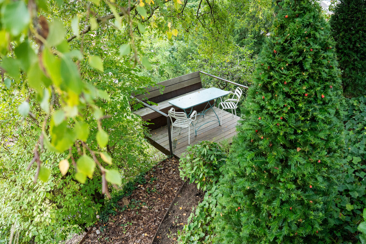 La propriétaire apprécie particulièrement ce jardin qu’elle considère comme un véritable havre de paix, apaisant et source de tranquillité, où chaque espace invite à la détente et à la contemplation.