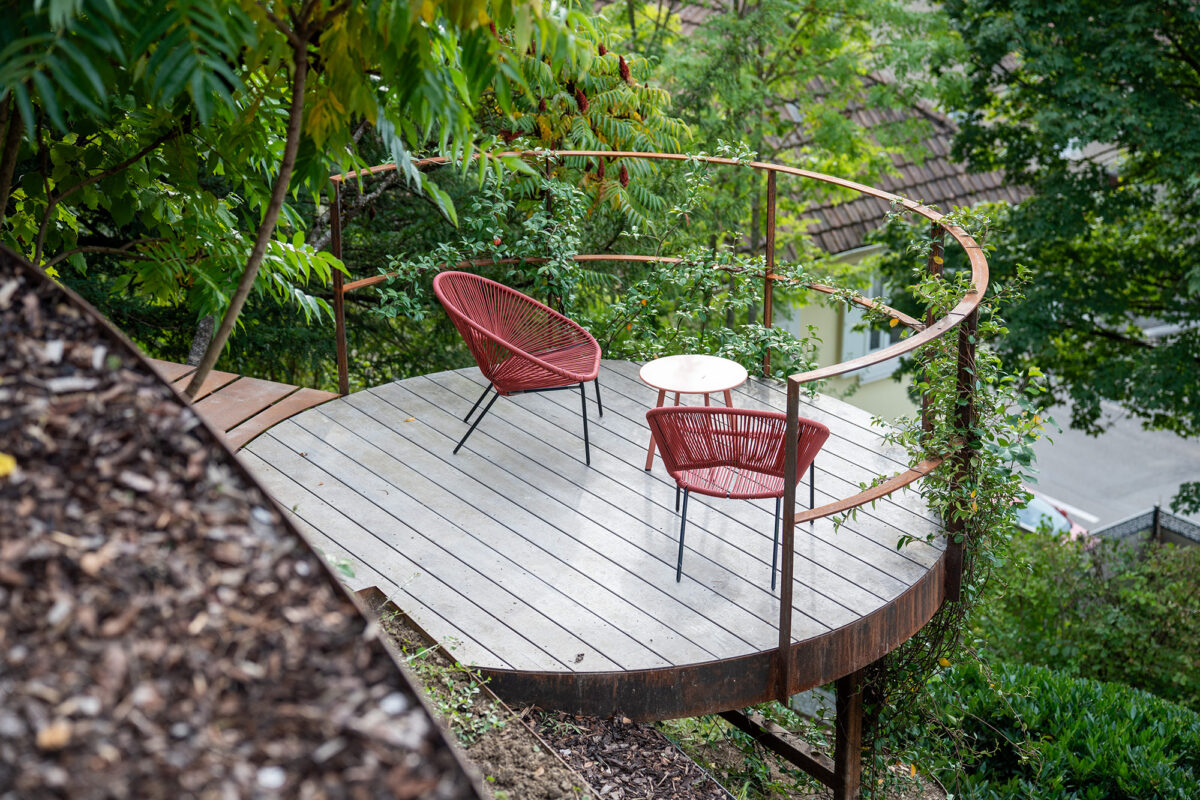 Situé dans un quartier résidentiel de Mulhouse, ce jardin en restanques était à l’origine une friche pentue et impraticable. La topographie difficile et le talus abrupt rendaient l’espace inutilisable, malgré le potentiel évident de créer un jardin unique.